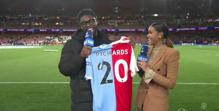 37岁的理查兹受邀现场批驳阿森纳vs马竞的欧冠比赛,当他站在镜头前时,转播员送给他一份相称的礼物。