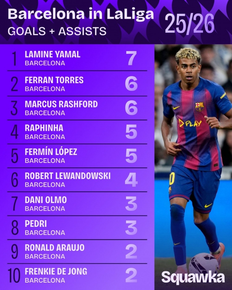 11月3日讯 据Squawka统计,巴萨本赛季5名球员联赛参与进球5+,五大联赛首队。
