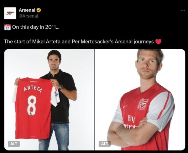 阿森纳官推晒照:2011年的今天,阿尔特塔&默特萨克开启枪手糊口