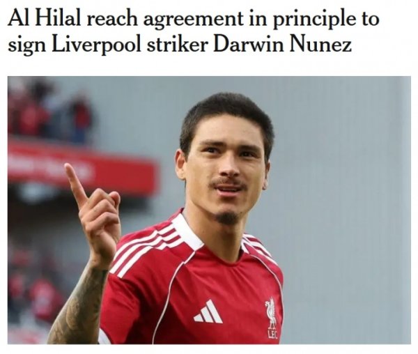 转战沙特!TA:月牙签努涅斯达原则性公约 转会费5300万欧元+浮动
