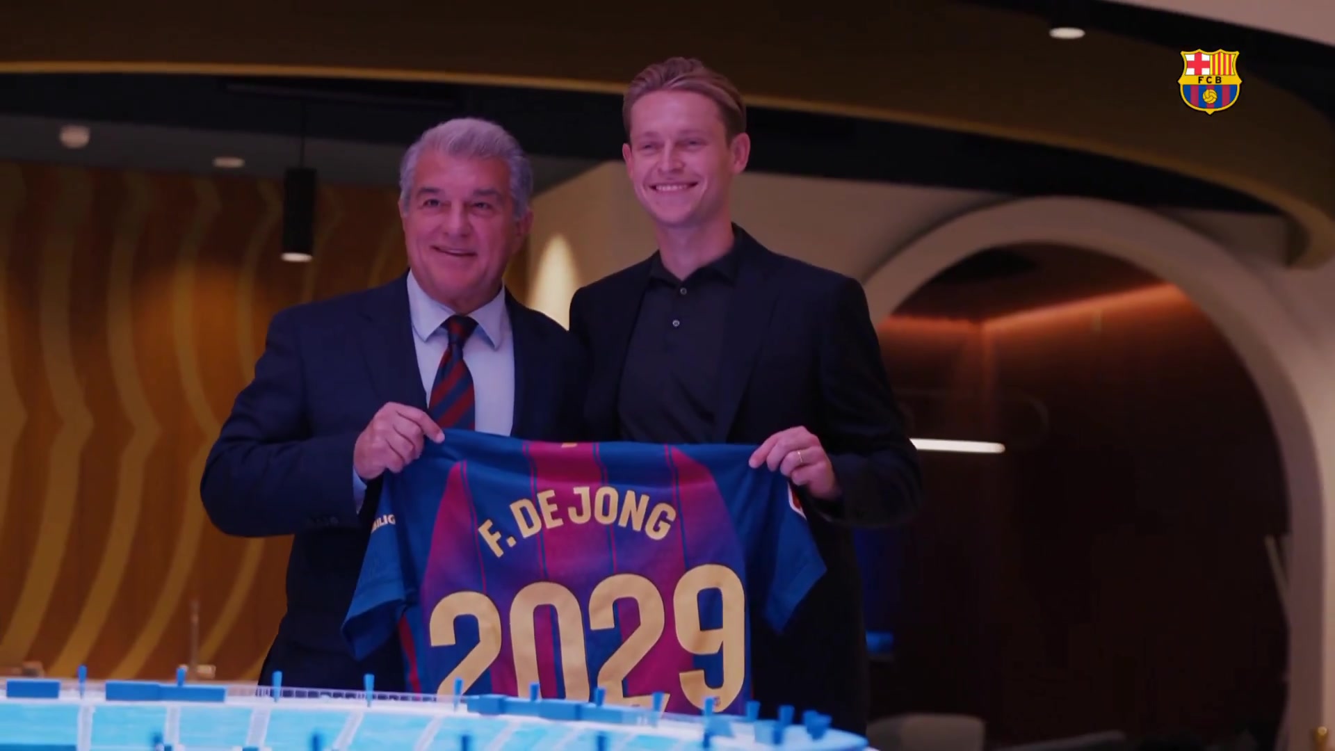 在续约完成后,巴萨在官方酬酢媒体上晒出拉波尔塔与德容展示球衣的视频,缅念念德容续约得胜,球衣上有2029字样。