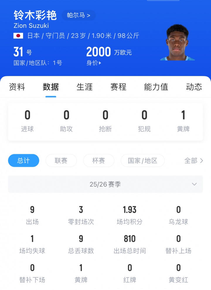 意甲第7轮,十东说念主帕尔马0-0战平热那亚,本场比赛日本门将铃木彩艳单场7次扑救力保球门不失,同期补时扑点立下大功。