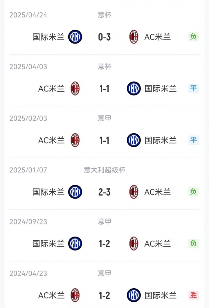 米兰德比战绩:米兰已不时6场不败,本场为229场德比中第75场告捷