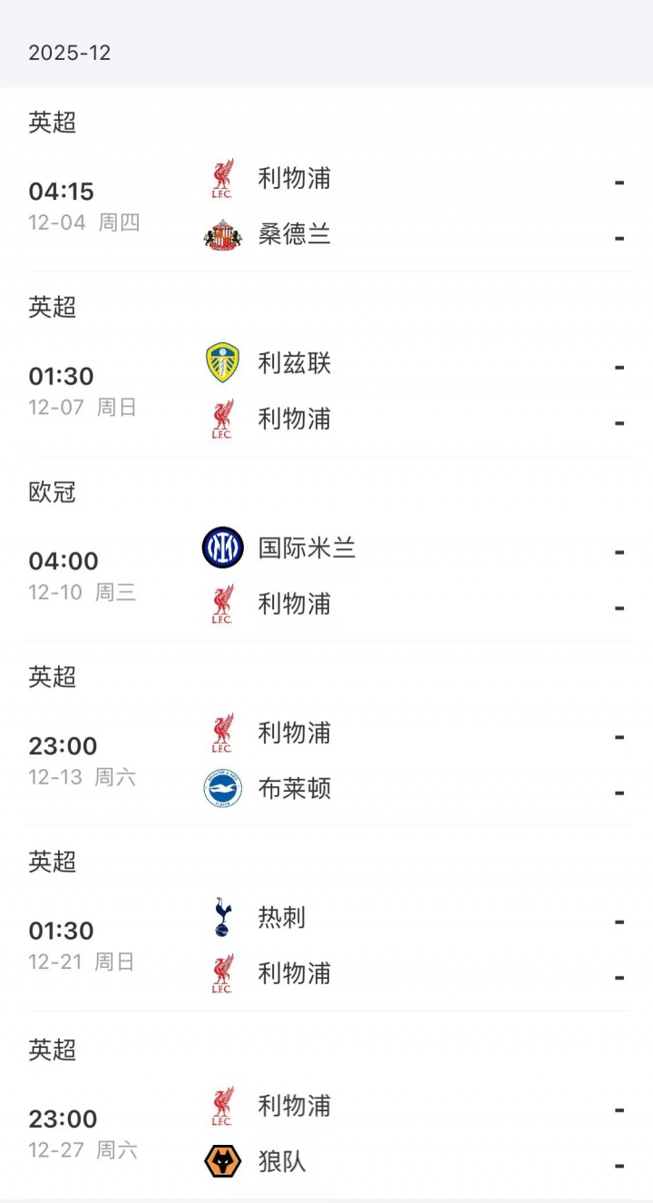 利物浦12月赛程
