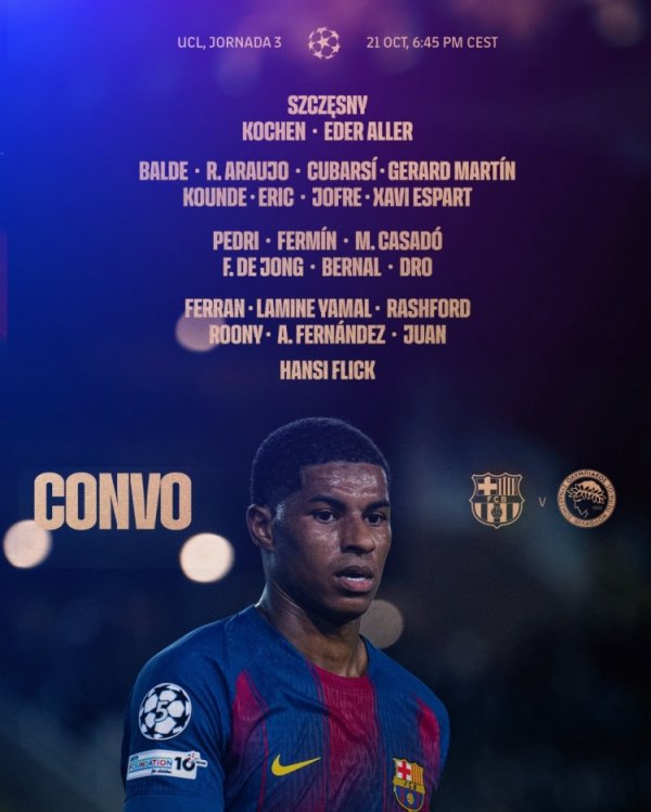 10月21日讯 北京技艺未来凌晨,巴萨将在欧冠联赛阶段第三轮比赛中主场对阵奥林匹亚科斯,巴萨公布了此役的球员名单。费兰-托雷斯纪念,克里斯滕森、莱万、拉菲尼亚、奥尔莫、霍安-加西亚、加维缺席。 巴萨本轮欧冠大名单 门将:什琴斯尼、科亨、埃德-阿勒 后卫:巴尔德、阿劳霍、库巴西、马丁、孔德、埃里克-加西亚、托伦茨、埃斯帕特 中场:佩德里、费尔明、卡萨多、德容、伯纳尔、德罗 先锋:费兰-托雷斯、亚马尔、拉什福德、巴德吉、托尼-费尔南德斯、胡安-埃尔南德斯......查看更多