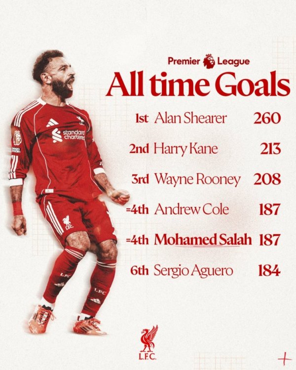 利物浦官方晒英超历史弓手榜:萨拉赫187球追祯祥迪-科尔比肩第四