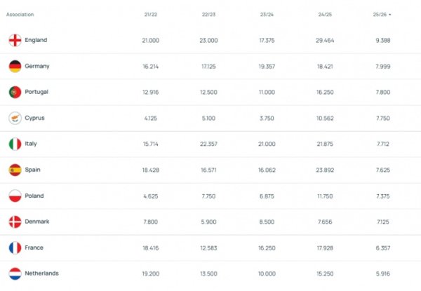 欧战本赛季最新积分:英格兰、德国、葡萄牙前三,塞浦路斯第四!