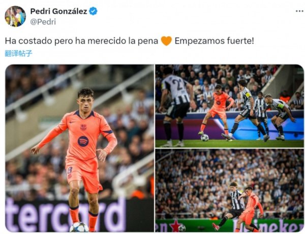 9月19日讯 欧冠联赛阶段首轮比赛,佩德里踢满全场,匡助巴萨客场2-1打败纽卡。 佩德里社媒晒出比赛像片,配文:“固然流程很劳作,但一切王人值得🧡咱们强势开局!”......查看更多