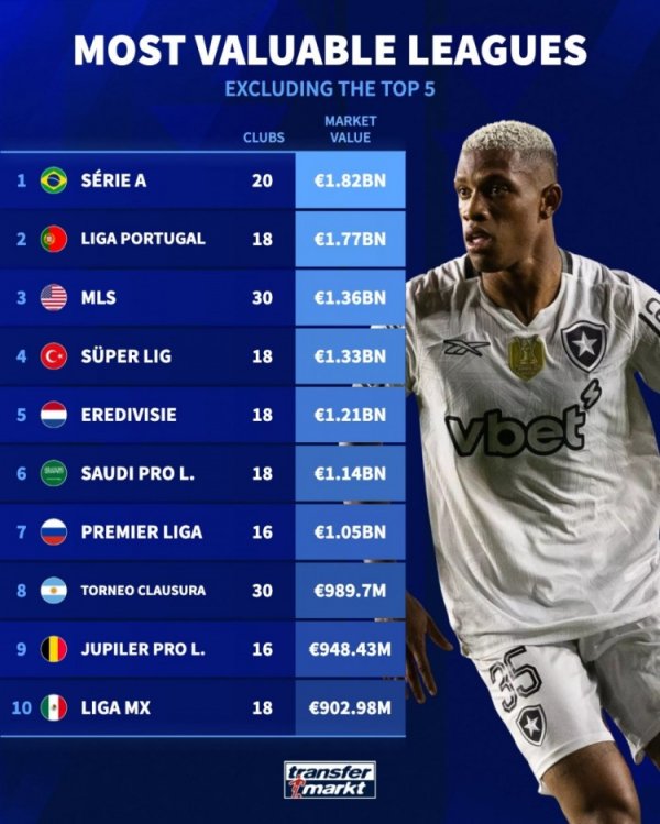 五大联赛除外联赛身价名次:巴甲18.2亿欧居首,葡超17.7亿欧第二