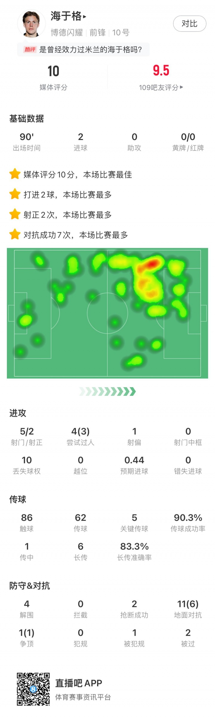 10月01日讯 欧冠联赛阶段第2轮,博德能干主场2-2平热刺,25岁的海于格梅开二度,媒体评分10分。