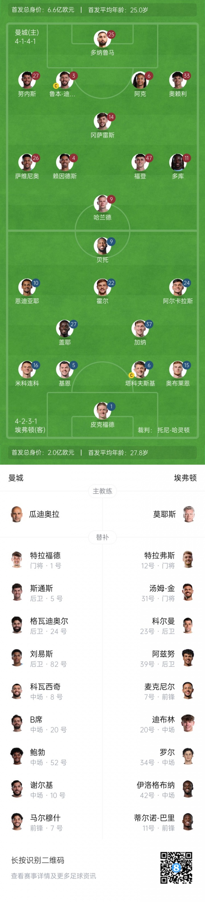 曼城首发:25-多纳鲁马、3-鲁本-迪亚斯、6-阿克、33-奥赖利、4-赖因德斯、14-尼科-冈萨雷斯、27-努内斯、9-哈兰德、11-多库、26-萨维尼奥、47-福登