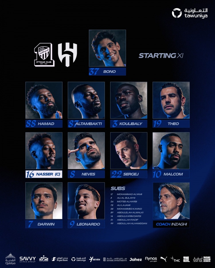 利雅得眉月首发:37-布努、19-特奥、3-库利巴利、87-坦巴蒂、88-哈马德-亚米、10-马尔科姆、22-米林科维奇、8-鲁本-内维斯、16-纳赛尔-多萨里、9-莱昂纳多、7-努涅斯