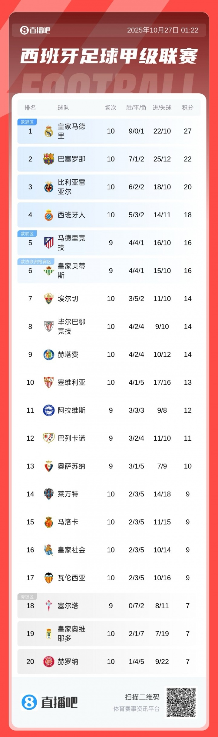 皇马27分领跑积分榜,卓绝巴萨5分。