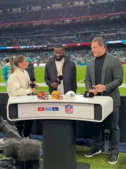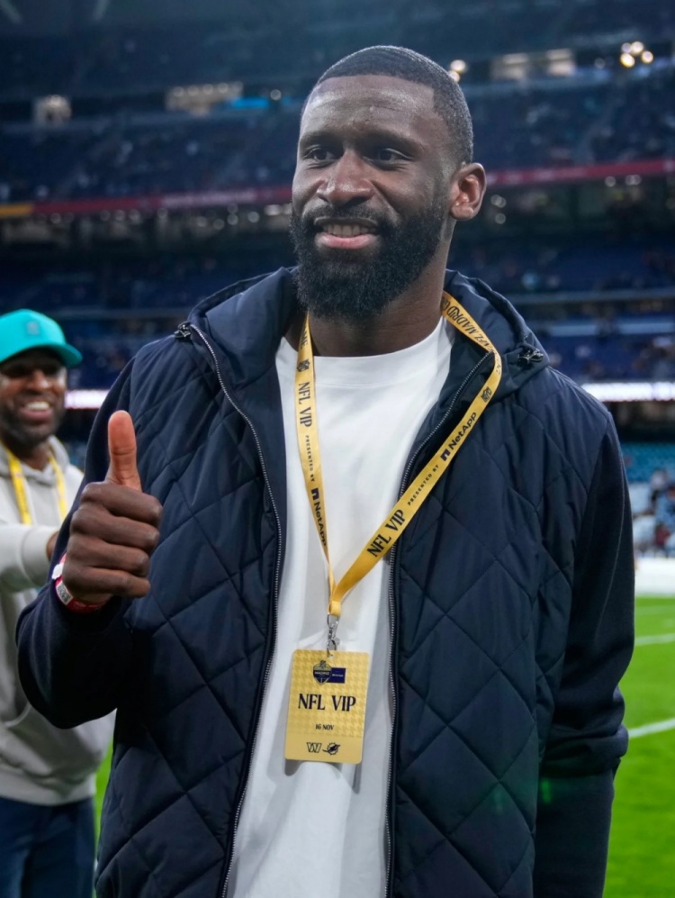 NFL西班牙赛昨晚在伯纳乌球场进行,迈阿密海豚16-13打败华盛顿训诫官,吕迪格受邀现场不雅看这场比赛,并被请上批驳席。他在应对媒体上晒出相片,皆达内出镜。