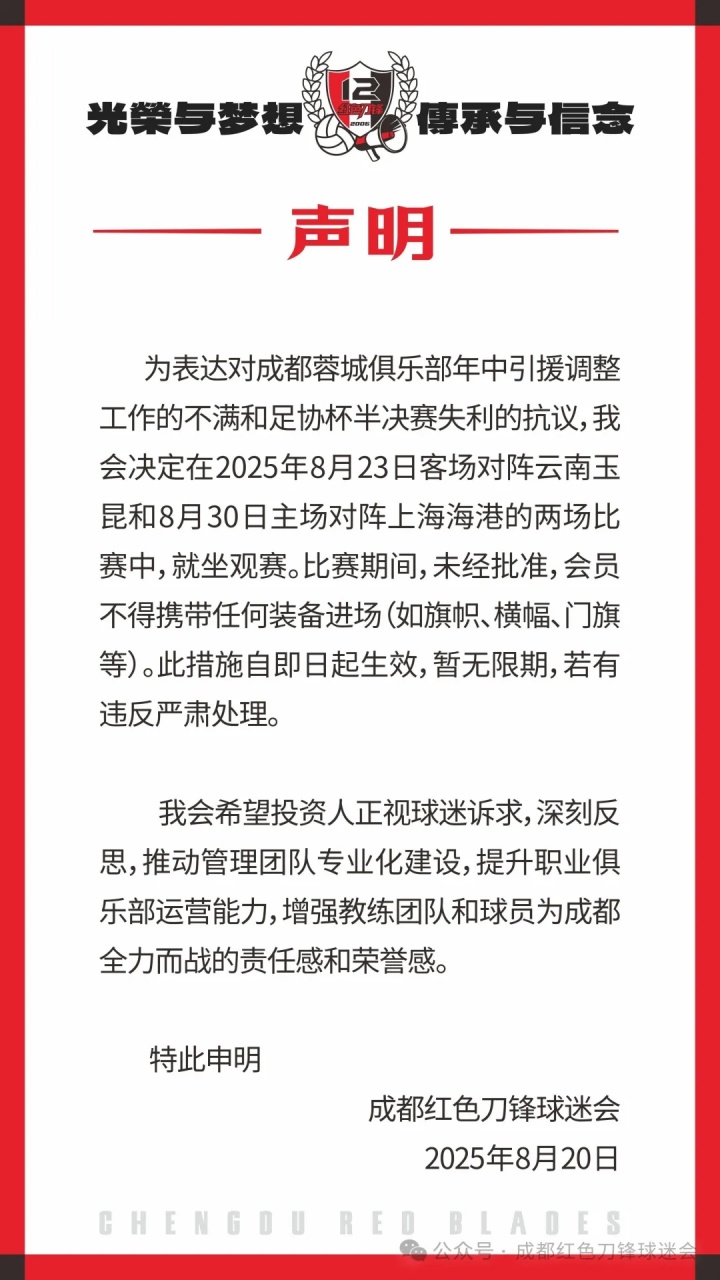 为抒发对成齐蓉城俱乐部年中引援疏通责任的不悦和足协杯半决赛失利的抗议,我会决定在2025年8月23日客场对阵云南玉昆和8月30日主场对阵上海海港的两场比赛中,就坐不雅赛。比赛手艺,未经批准,会员不得佩戴任何装备进场(如旌旗、横幅、门旗等)。此次序自即日起顺利,暂无尽期,若有违背严肃处理。