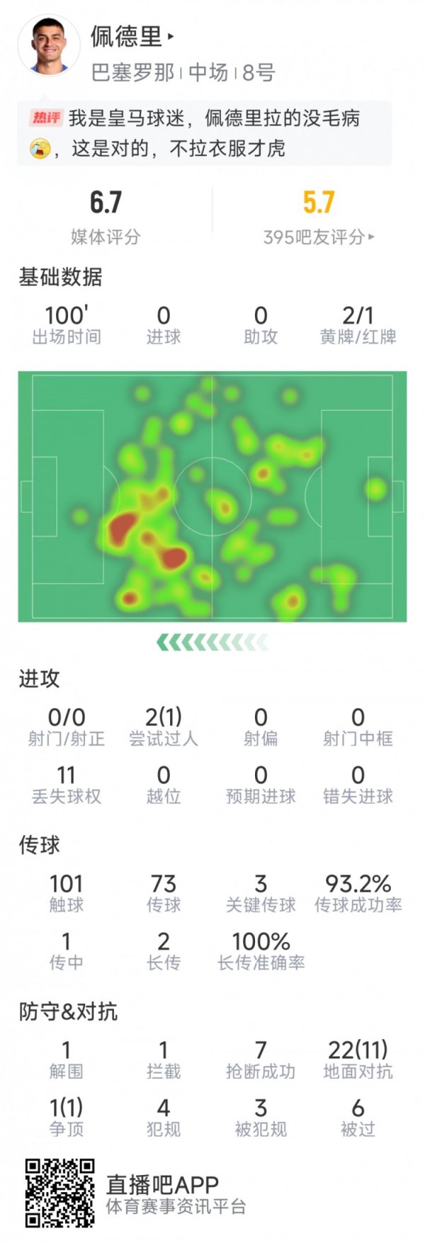 佩德里本场数据:3次关节传球,7次抢断,临了工夫两黄被罚下