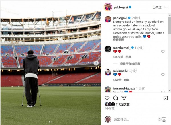 加维社媒:很交运攻入老诺坎普临了一球,期待与球迷享受新球场