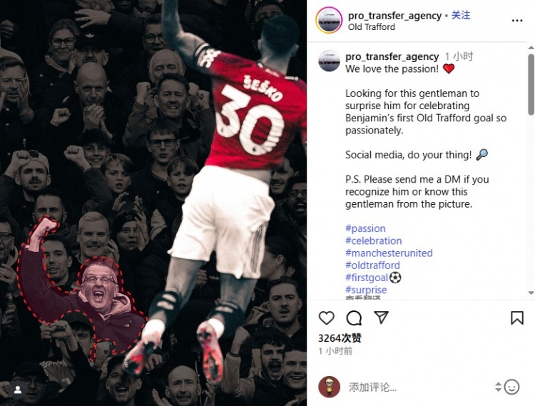 舍什科的经纪公司Pro Transfer Agency晒出这位球迷的相片,并写说念:“咱们爱这份情感!正在寻找这位先生,思给他个惊喜,因为他为舍什科的老特拉福德首球进行了如斯关心的庆祝。”