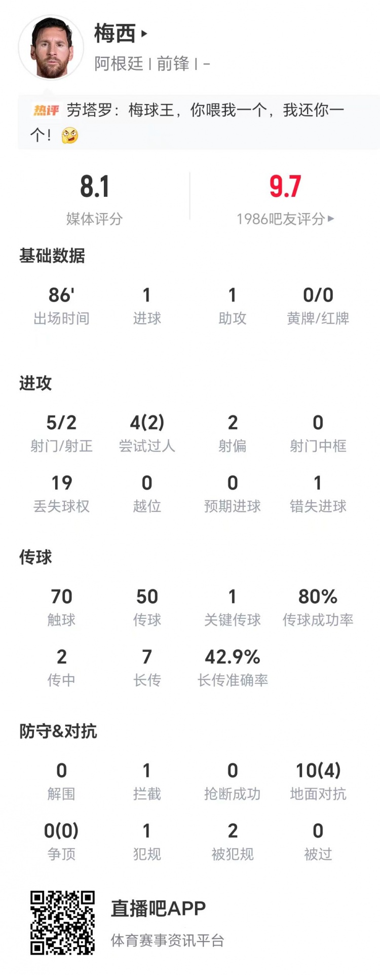 本领统计数据显现,梅西本场比赛5射两正,打进1球并送出1次助攻,4次过东说念主两次告成,1次重要传球,10次大地招架告成4次,获评8.1分。
