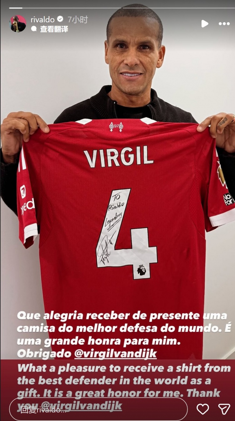11月28日讯 巴西足坛传闻里瓦尔多更新社媒动态,晒出范戴克的球衣。