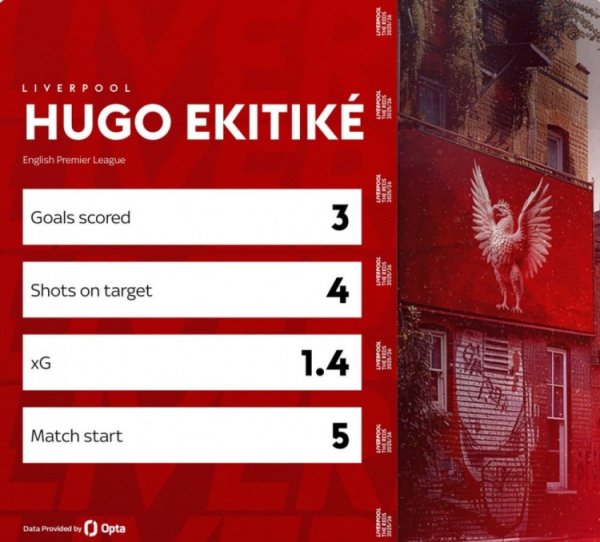 埃基蒂克加盟利物浦以来5场英超都首发,射正4次打进3球