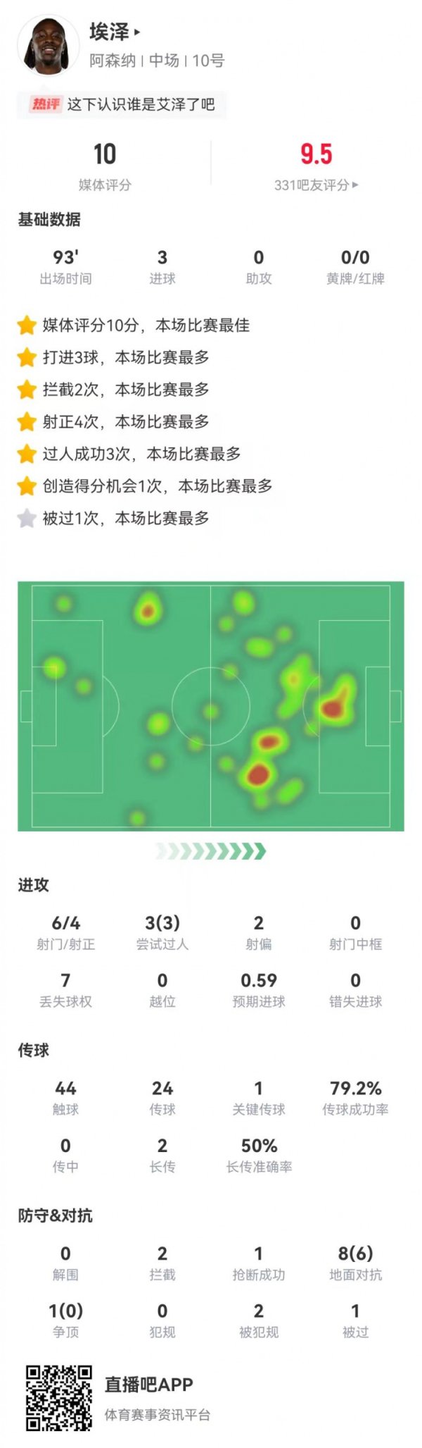 埃泽本场6射4正进3球+1缺欠传球 3过东谈主3告捷+2造犯规 获评10分
