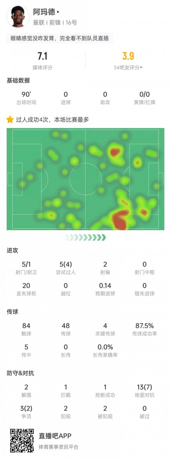 阿玛德本场数据:4次过东说念主到手全场最多,4次关键传球,获评7.1分