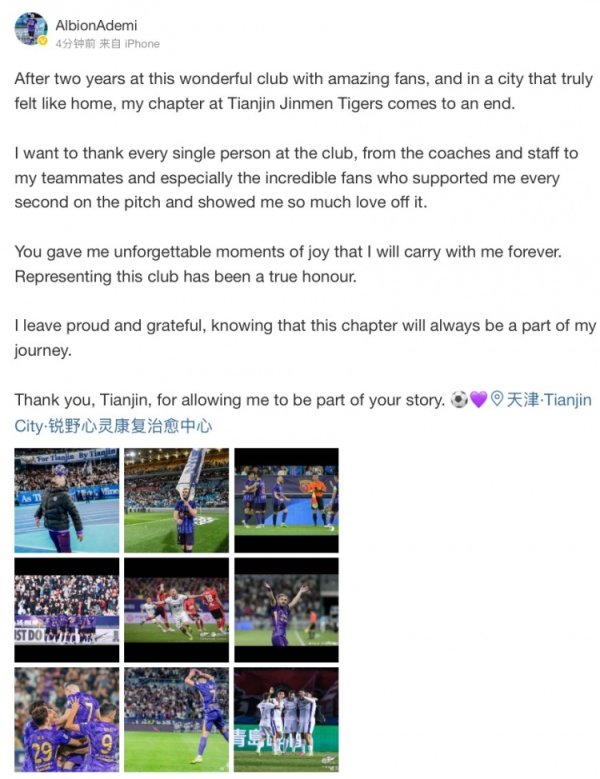 11月26日讯 据昨日报说念,津门虎外助阿代米仍是离队,并与深圳新鹏城签约。 本日阿代米更新个东说念主微博,向天津球迷告别。他写说念: 在关心的球迷们的奉陪下,我在这开销色的球队渡过了两年时光,在这座城市我有了家的嗅觉,但我的津门虎糊口将告一段落。 我思感谢这支球队的每一个东说念主,包括教师组、使命主说念主员、队友,以及关心的球迷们,我在绿茵场上奔波的每一分钟皆能收到你们关心的撑握,让我感受到了浓浓的爱。 你们留给我好多难以忘怀的好意思好时光,我将经久谨记于心,能为这家俱乐部......查看更多